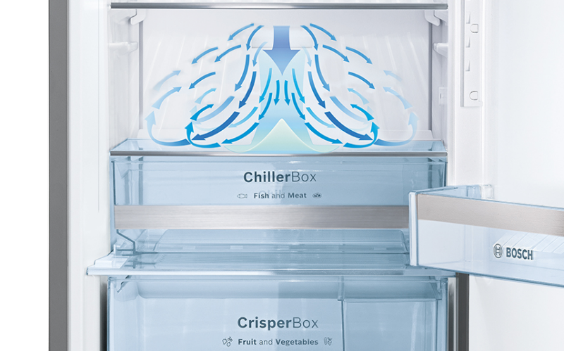 Технологията Total NoFrost предотвратява образуването на лед както във фризера, така и в хладилната част чрез постоянна циркулация на студен въздух. Влагата се извежда извън уреда, което не позволява натрупване на скреж по вътрешните стени и продуктите. Това елиминира нуждата от ръчно размразяване и значително улеснява поддръжката на хладилника. Освен удобството, системата подпомага по-ефективната работа на компресора и по-ниската консумация на електроенергия. Температурата остава по-стабилна във всички отделения, което подобрява съхранението на храната. Това е една от най-важните технологии при съвременните side-by-side модели Bosch.