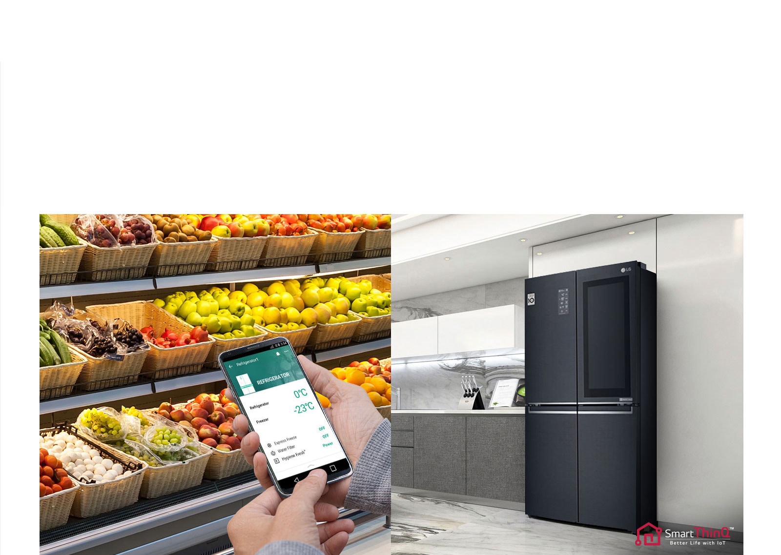Със съвместим смартфон и приложението LG SmartThinQ™ можете да регулирате температурните настройки дистанционно, за да охладите голямо разнообразие от храни.*
