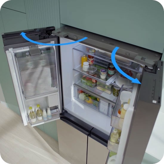 Хладилникът разполага с автоматично отварящи се врати със сензори за допир. Това е много удобно, когато ръцете са заети, а липсата на стърчащи дръжки допринася и за по-изчистена, премиум визия.