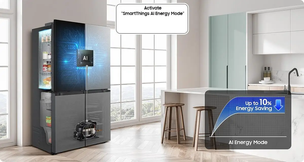 Моделът поддържа SmartThings AI Energy Mode, който според Samsung може да намали потреблението на енергия с до 10% чрез оптимизиране на скоростта на компресора и циклите на размразяване според начина на използване и околната среда. Това е силен плюс за клиенти, които държат на по-умен и по-икономичен дом.