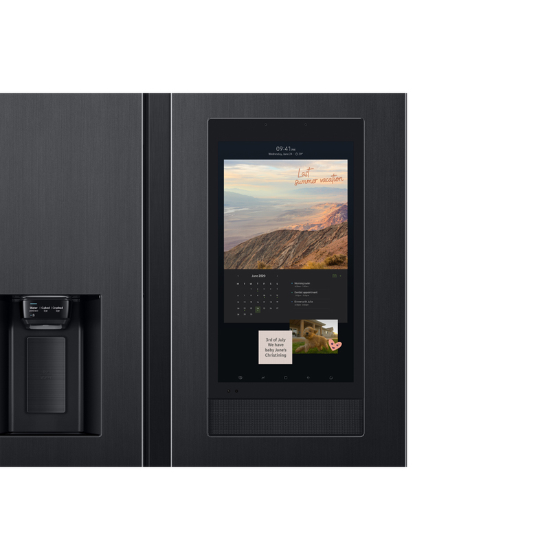 Family Hub™ превръща хладилника в център за семейна организация. Чрез големия 21.5-инчов сензорен дисплей можете да планирате менюта с Meal Planner, да записвате бележки и снимки на Family Board, да гледате телевизионно съдържание или да огледалите телефона чрез SmartView. Достъпни са музикални приложения като Spotify и TuneIn, а чрез интеграцията с Ring и Bluetooth Call можете да приемате обаждания и да виждате кой звъни на входната врата.